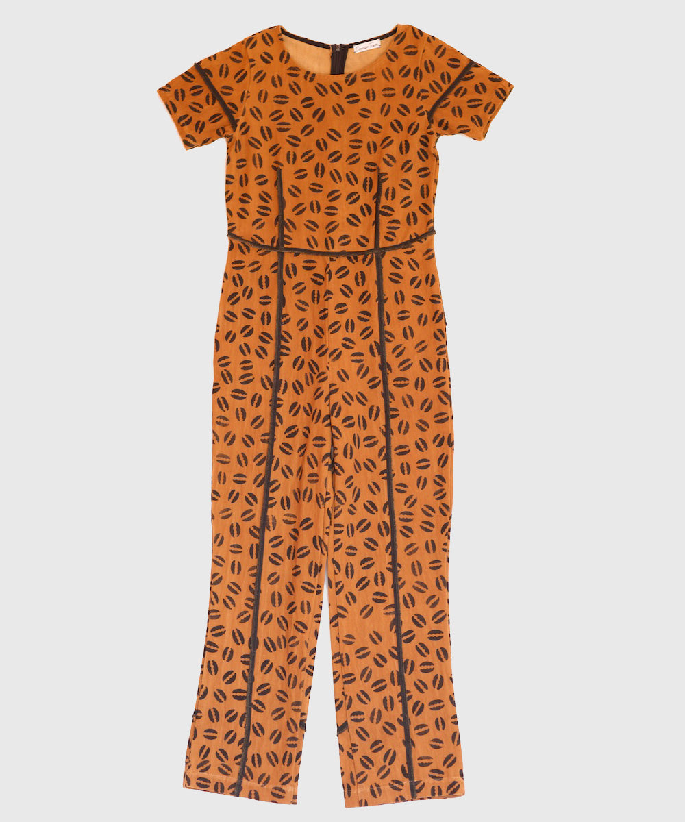 Floor length Koloni print jumpsuit tailored with hand-appliqué black Bogo fabric giving a silhouette that stands out.