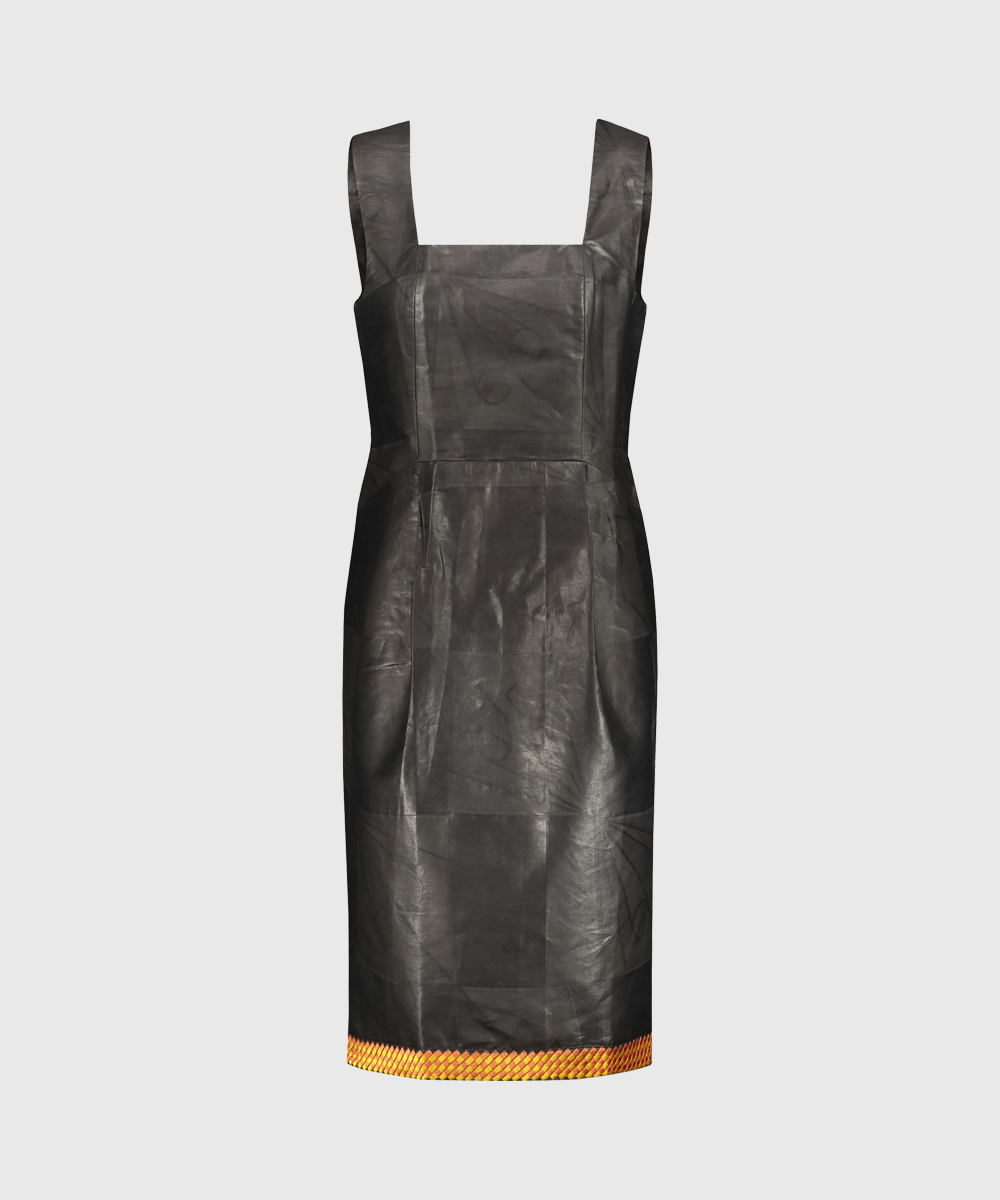 Cocktail dress with orange and yellow embroidery at the hem, just above the knee