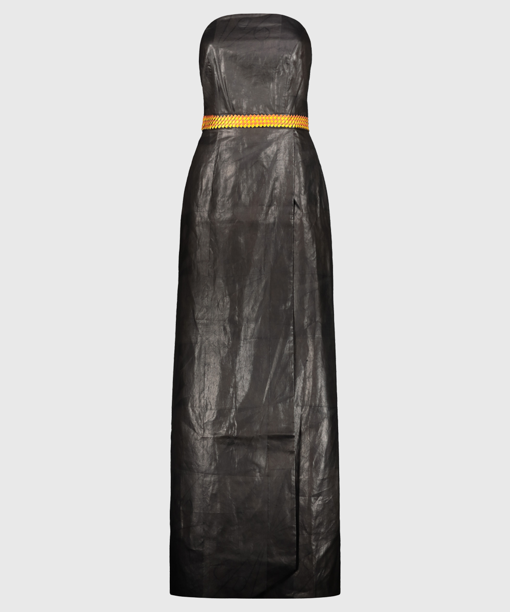 Long strapless dress, the dress is cinched and embroidered below the chest and has a stylish opening in the front