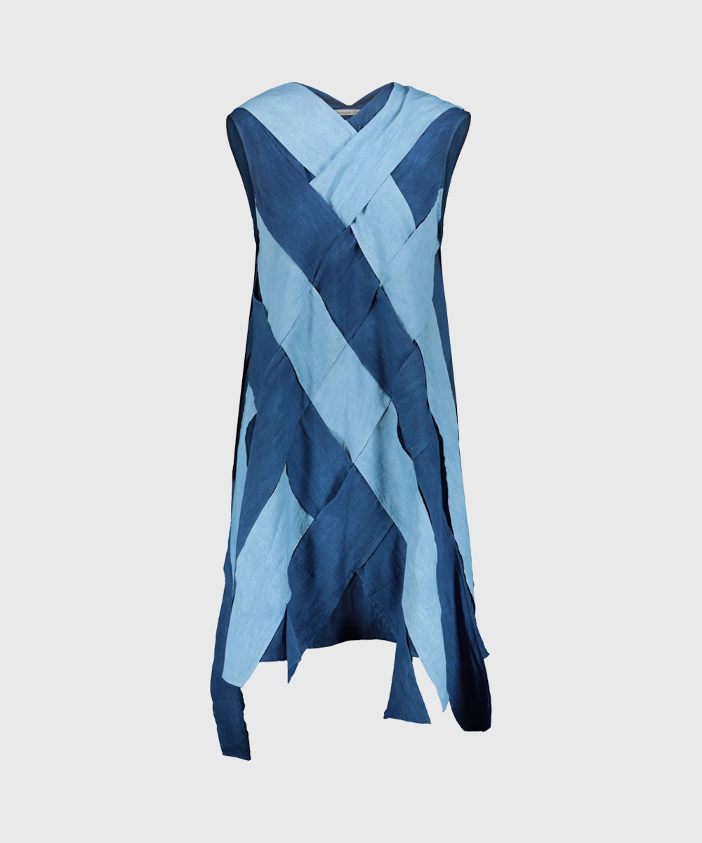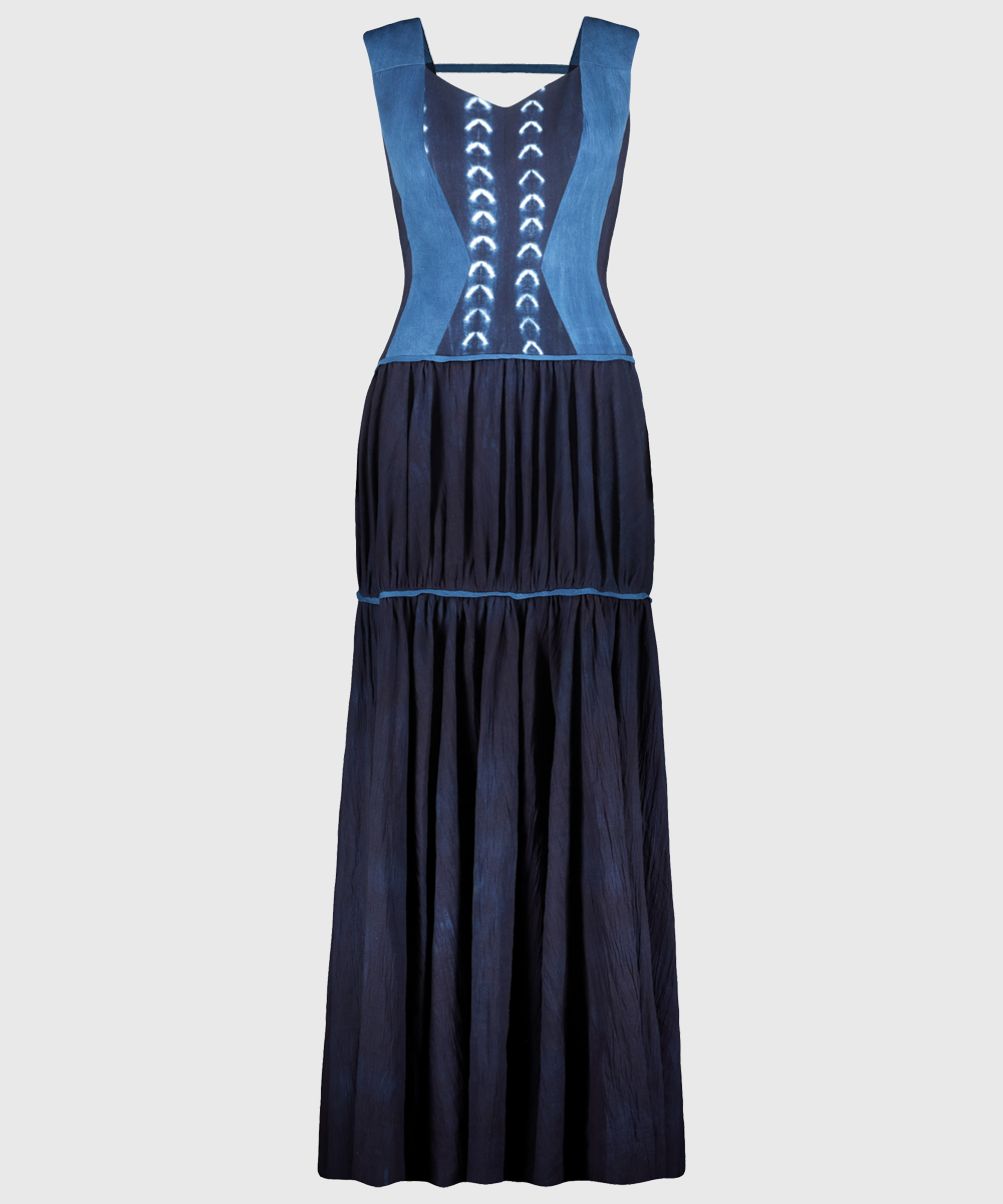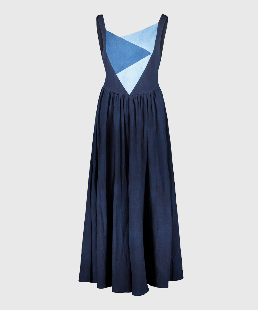 Graceful midi dress with geometric patchwork detail in indigo hues ideal for the beautiful days