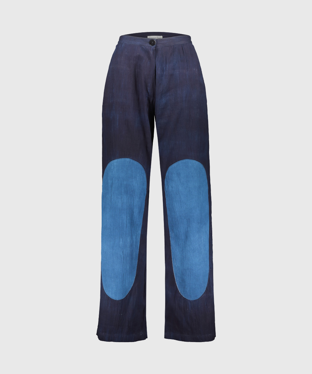 Pretty, loose pants made with a beautifully textured pure silk with a light indigo blue cotton hem finish. Perfect to suit all body types because it is easily adjustable by the elastic waist, the timeless pants fit almost any o...
