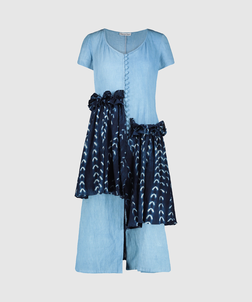 Crafted with lightweight light blue Indigo cotton, the buttons midi dress with asymmetrical tie-and-dye Mounounankoulouni ruffles offers a relaxed fit