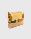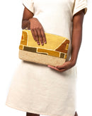Raffia and up-cycled Sira print fabric pochette; handcrafted for an authentic look that is timeless.