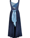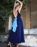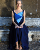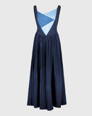 Graceful midi dress with geometric patchwork detail in indigo hues ideal for the beautiful days